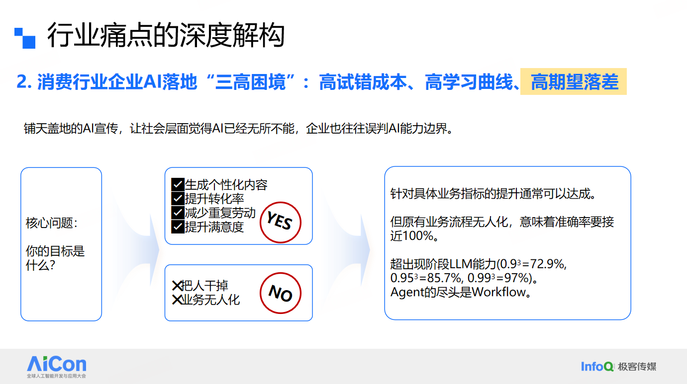 而从企业端来看,AI落地则陷入“三高困境”:“高试错成本”让企业在技术投入上望而却步;“高学习曲线”使得一线人员对复杂的提示工程、知识库运维望而生畏,“高期望落差”则让许多企业在“AI万能论”的幻想与实际效果之间感受到明显落差。