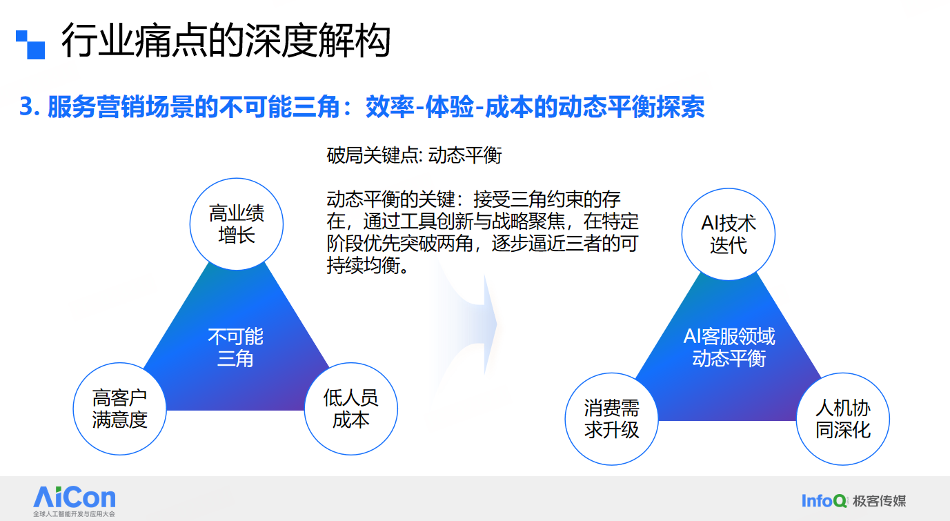 深入服务营销的业务场景,高业绩增长-高客户满意度-低人员成本则构成了一个“不可能三角”,AI技术的发展,也让企业对打破这个不可能三角抱有希望。然而,这个不可能三角的背后,其实是效率、体验和成本三者难以平衡兼得的困境。