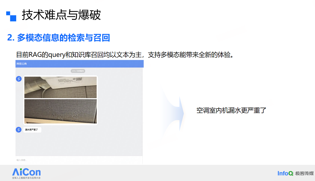 2. 多模态信息处理:突破传统文本交互限制,支持图片等多模态信息检索。当用户发送“空调漏水”的照片时,Agent能结合图片内容与故障知识库,快速定位问题原因并给出解决方案。